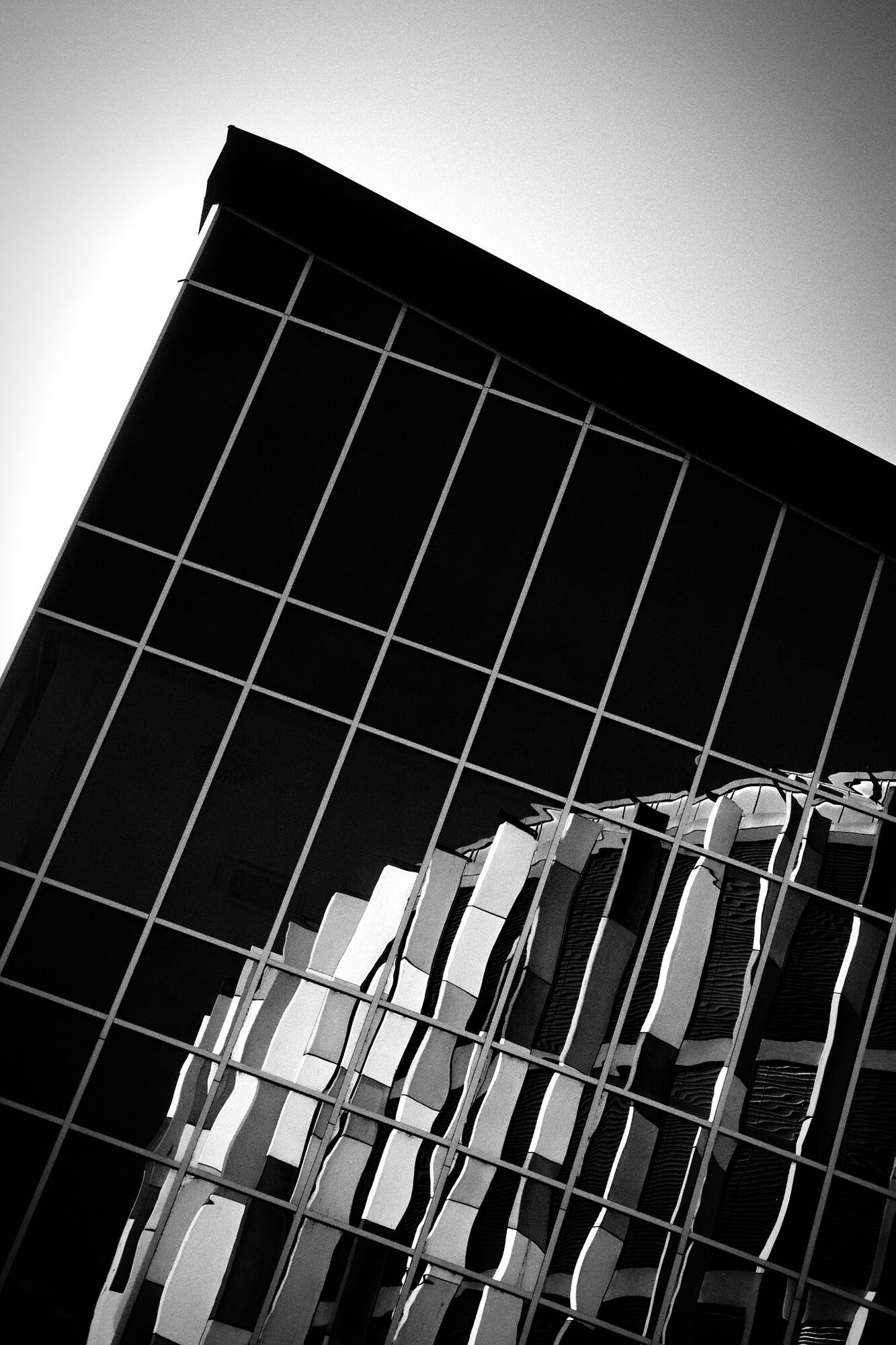 I FOCUS ON THE GRID-LIKE GEOMETRY OF THE FAÇADE AND THE FLUID DISTORTIONS CREATED BY ITS CURVED GLASS SURFACES.